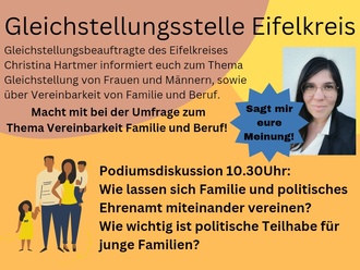 Auch die Gleichstellungsstelle des Eifelkreises Bitburg-Prüm wird mit einem Stand teilnehmen und zum Thema Gleichstellung von Männern und Frauen sowie zur Vereinbarkeit von Familie und Beruf informieren und in den Austausch treten. Um 10:30 Uhr wird es dazu eine Podiumsdiskussion mit lokalen Politikerinnen und Politikern geben zum Thema „Wie lassen sich Familie und politisches Ehrenamt miteinander vereinbaren? Wie wichtig ist politische Teilhabe für junge Familien? Mehr unter www.kutz-bitburg.de