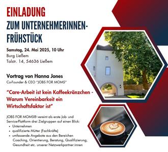 Beim gemeinsamen Frühstück ist Gelegenheit zum Kennenlernen und Austauschen. Referentin Hanna Jones wird einen Input geben zum Thema „Care-Arbeit ist kein Kaffeekränzchen – Warum Vereinbarkeit ein Wirtschaftsfaktor ist“. Hanna Jones ist Co-Founderin der Service Plattform „JOBS FOR MOMS“, die als erste Job- und Service-Plattform drei Zielgruppen auf einen Blick vereint: Unternehmen, qualifizierte Mütter (Fachkräfte) sowie umfassende Angebote aus den Bereichen Coaching, Orientierung, Beratung, Qualifizierung, Gesundheit etc. unserer Netzwerkpartnerinnen.