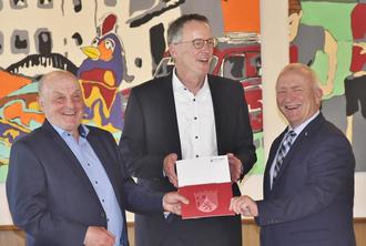 Von links: Ortsbürgermeister Karl Hansen, Innenminister Michael Ebling und Bürgermeister Aloysius Söhngen bei der Übergabe des Förderbescheids an die Ortsgemeinde Hersdorf (Foto: VG Prüm).
