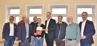 Förderbescheidübergabe an die Ortsgemeinde Wawern: Innenminister Michael Ebling mit dem Ersten Kreisbeigeordneten Michael Ludwig, MdL (1.v.li.), MdL Nico Steinbach (1.v.re.), Bürgermeister Aloysius Söhngen (3.v.li.), Ortsbürgermeister Axel Goldmann (2.v.re.) sowie Vertreterinnen und Vertreter der Planungsgruppe „Dorfplatz“ (Foto: VG Prüm)