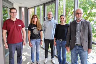 Die Umsetzung der OZG-Leistung Elterngeld wurde gemeinsam vom Jugendamt der Kreisverwaltung und dem Fachbereich Organisation, Zentrale Dienste, Digitalisierung geleistet. Von links: Yannik Koch, Birgit Elsen, Simon Lippert, Judith Reinhard, Amtsleiter Stefan Urmes (Foto: Kreisverwaltung).