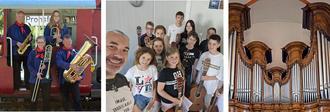 Musiker des Musikvereins Pronsfeld (Foto: B. Kaufmann); Gitarrenkurs der Musikschule des Eifelkreises (Foto: Frank Rohles); Orgel der Sankt-Salvator-Basilika in Prüm (Foto: Thomas Hummel, CC BY-SA 4.0 via Wikimedia Commons)