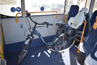 Ein Fahrrad im Bereich der Sondernutzungsfläche im Bus. Während der Fahrt muss der Fahrgast das Rad sicher festhalten. Kinderwagen und Rollstühle haben hier aber immer Vorrang (Foto: VRT)