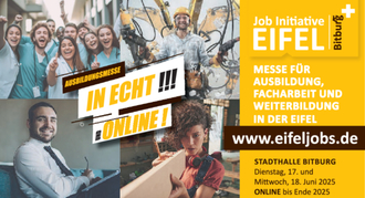Die „Job Initiative EIFEL - eifeljobs.de“ geht am 17. und 18. Juni 2025 in die 12. Runde und setzt mit über 60 Ausstellern erneut Maßstäbe in der regionalen Berufsorientierung. Präsentiert wird die Job Initiative EIFEL von Bohl Design & Kommunikation in Zusammenarbeit mit dem Hauptpartner Volksbank Trier Eifel eG sowie mit Unterstützung der Bitburger Braugruppe, der Stadt Bitburg und dem Gewerbeverein Bitburg.