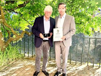 Hans-Michael Bröhl freut sich gemeinsam mit Bürgermeister Moritz Petry (Verbandsgemeinde Südeifel) über die Auszeichnung mit der Ehrennadel „Ilex in Silber“ (Foto: Naturpark Südeifel/Daniela Torgau)