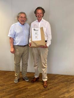 MdL Dr. Joachim Streit (rechts) freut sich mit Paul Kremer über sein Abschiedsgeschenk: regionale Produkte aus den drei Naturparken. Foto: Naturpark Südeifel/Daniela Torgau