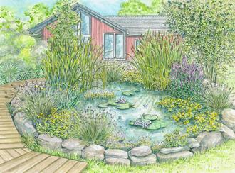 Zur Abdichtung von Gartenteichen haben sich Folien gegen Kunststoffbecken durchgesetzt, denn Untersuchungen zeigen, dass Mikroplastik im Boden negative Folgen für Tiere und Pflanzen haben kann. Oft verwendet wird PVC-Folie, aber ihre Herstellung und Entsorgung ist aus ökologischer Sicht problematisch, weil sie Weichmacher enthält. Teichfolie aus sogenanntem EPDM (Ethylen-Propylen-Dien-Monomer) gewinnt deshalb immer mehr an Bedeutung. Der synthetisch hergestellte Kautschuk ist zwar teurer als PVC-Folie, aber dafür robuster, langlebiger und enthält keine Weichmacher. Ein Folienteich sollte immer in einem Stufenprofil angelegt werden. Das Profil bietet den verschiedenen Ansprüchen der Teichpflanzen gute Wachstumsvoraussetzungen und erleichtert die Teichpflege. An das Ufer schließt sich die etwa 10 bis 20 Zentimeter tiefe Sumpfzone an, darauf folgt die rund 40 bis 50 Zentimeter tiefe Flachwasserzone und in der Mitte befindet sich die Tiefwasserzone mit 80 bis 150 Zentimeter Wassertiefe. Zur Bepflanzung der Sumpfzone eignet sich beispielsweise die Sumpfdotterblume (Caltha palustris), in der Flachwasserzone fühlt sich die Wasserfeder (Hottonia palustris) wohl, in der Tiefwasserzone gedeiht ein Klassiker der Gartenteichgestaltung hervorragend: die Seerose (Nymhaea alba).