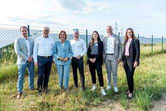 Von links: Bastian Fiedler (Leiter Projektentwicklung Solar, Trianel GmbH), Herbert Muders (Geschäftsführer, Trianel Energieprojekte GmbH &Co. KG), Ministerpräsidentin Malu Dreyer, Sven Becker (Geschäftsführer Trianel GmbH), Alina Schatke (Projektleiterin Solar, Trianel GmbH), Landrat Andreas Kruppert, Bürgermeisterin Janine Fischer (Fotos: Trianel)