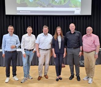 Gemeinsame Sitzung der kommunalen Gremien in der Bitburger Stadthalle. Von links: Andreas Hilgert (Projektgesellschaft Bitburg Housing), Jan Eitel (Quartiersmanufaktur), Bürgermeister Joachim Kandels (Stadt Bitburg), Bürgermeisterin Janine Fischer (VG Bitburger Land), Landrat Andreas Kruppert, Helmut Berscheid (Zweckverband Flugplatz Bitburg). Foto: Zweckverband Flugplatz Bitburg