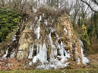 sich bei Regen das Kohlendioxid mit Wasser zu Kohlensäure. Trifft dieser säurehaltige Regen auf kalkhaltiges Gestein, wie hier an der Tränenlay, wird der Kalk gelöst. Dieser Kalk kann sich, wenn das Quellwasser der Tränenlay über den Fels fließt, nicht lange halten, da das Kohlendioxid entweicht. Der Kalk setzt sich durch die Turbulenzen als Kruste ab. Das Moos an den Felsen verstärkt diesen Prozess um ein Vielfaches, da es dem Wasser zusätzlich Kohlendioxid entzieht und sich der Kalk auf den Moosen als Kruste ablagert. Über Jahrtausende wächst das sogenannte Kalktuffgestein heran. Es ist ein sehr leichtes Gestein mit zahllosen Hohlräumen und in früherer Zeit ein beliebtes Baumaterial, luftig, leicht und dennoch stabil und witterungsbeständig.