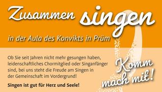 Alle – ob jung oder alt, Anfänger oder erfahrene Sänger – sind herzlich eingeladen, gemeinsam zu singen. Im Vordergrund steht die Freude am Singen in der Gemeinschaft. Die Teilnahme ist frei. Veranstalter: Demenznetzwerk Eifelkreis, Melanie Bischof, Tel. 06561 15-5209. Leitung: Reiner Klein, Musikschule Kalimba, Tel. 0176 21035948.