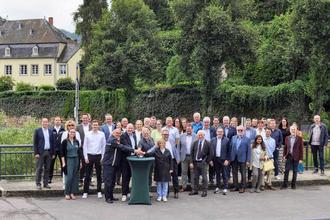 Startsignal für die digitalen Hochwassermelder mit zahlreichen Gästen auf der Prümbrücke in Holsthum. Vorne von links: BKI Jürgen Larisch, Landrat Andreas Kruppert, Ortsbürgermeister Klaus Reschke, der Erste Beigeordnete Michael Ludwig, MdL sowie Klimaschutzministerin Katrin Eder (Foto: Kreisverwaltung)
