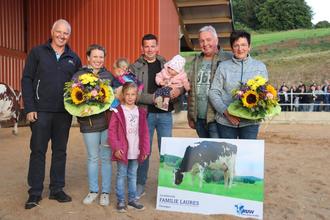 Der Vorsitzende der Züchtervereinigung Eifel, Alfred Bormann (links), überreichte als Dankeschön ein Hofschild mit ihrer Lieblingskuh Vaiana und Blumen an die Familie Laures (Foto: Grebener).