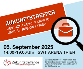 Die Agentur für Arbeit Trier lädt – gemeinsam mit den Partnern des Zukunftstreffer-Netzwerks, zu dem auch die Wirtschaftsförderung des Eifelkreises Bitburg-Prüm gehört, – am Freitag, 5. September 2025 von 14 bis 19 Uhr, zur Job- und Weiterbildungsmesse „Zukunftstreffer – DEIN JOB | DEINE KARRIERE | UNSERE REGION | TRIER“ in die SWT Arena Trier (Fort-Worth-Platz 1, 54292 Trier) ein.