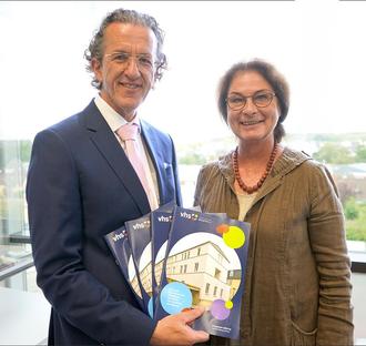 Dr. Barbara Mikuda-Hüttel, ehrenamtliche pädagogische Leiterin der Volkshochschule des Eifelkreises, übergab dem KVHS-Vorsitzenden Dr. Joachim Streit, MdL, das neue Programmheft 2023/24.