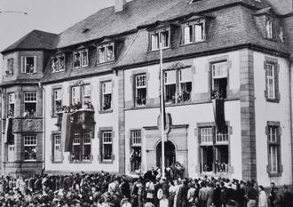 Auf dem hier gezeigten Foto, das mit einem Besuch des Bundespräsidenten im Bitburger Kreishaus in Verbindung gebracht wird, findet sich auf der Rückseite die Angabe 1958 als Jahr der Aufnahme. Diese Zahl wurde von einer unbekannten Person durchgestrichen und mit der Zahl 1953 überschrieben. Gleichzeitig gibt es jedoch Anhaltspunkte, dass Prof. Theodor Heuss im Jahr 1958 in der Region Trier anwesend war: Am 09.09.1958, also vor 65 Jahren, nahm der damalige Bundespräsident Theodor Heuss in Trier an der Jahresversammlung des Kulturkreises des BDI (Bundesverband der Deutschen Industrie) teil. Es ist also möglich, dass er auf dem Weg nach Trier wieder Bitburg besucht haben könnte. Hierzu gibt es jedoch keine schriftlichen Quellen.