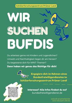 Ab sofort vergibt das SFZ zwei Stellen im Rahmen eines Bundesfreiwilligendienstes: Als Bufdi unterstützt du das junge Team bei der Betreuung der Forschenden, hilfst bei Veranstaltungen, Workshops und Projekten mit und kannst auch eigene Ideen einbringen. Die Stelle ist ideal für alle, die Freude an Wissenschaft und Umwelt haben und gerne mit Kindern und Jugendlichen arbeiten.