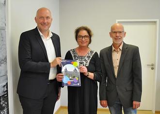 Landrat Andreas Kruppert erhält das neue Bildungsprogramm von Dr. Barbara Mikuda-Hüttel und kvhs Geschäftsführer Alfred Marder (Foto: Kreisverwaltung)