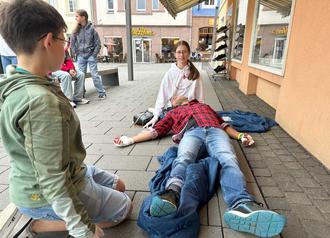 Insgesamt sind in diesem Jahr knapp 30 Wettbewerbsgruppen in drei Stufen (Altersstufen 1 und 2 sowie Schulsanitätsdienst) bei den Landeswettbewerben angetreten. Unter ihnen waren auch zwei JRK-Gruppen in der Wasserwacht aus dem DRK-Landesverband Nordrhein e.V. Im Wettbewerbsparcours mussten die Gruppen nicht nur ihr Erste-Hilfe-Können – etwa bei Verletzungen durch einen Fettbrand – unter Beweis stellen, sondern auch Aufgaben aus dem sozialen und musisch-kulturellen Bereich lösen. Unter anderem ging es darum herauszustellen, wie das Leben mit einer Behinderung aussieht. Dabei beschäftigten sich die Teilnehmenden mit der Geschichte der Gebärdensprache. Bei der Produktion eines Imagefilms über das Jugendrotkreuz war dagegen viel kreatives Geschick gefragt. Die Stationen des Wettbewerbsparcours waren in ganz Bitburg verteilt, was auch bei Passant*innen für viel Aufmerksamkeit und spannende Begegnungen sorgte.