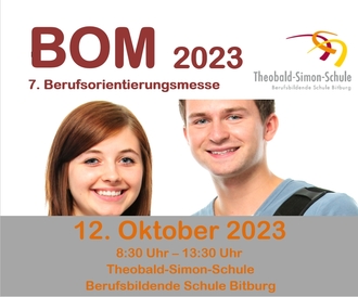 Am Donnerstag, den 12.10.2023 veranstaltet die Theobald-Simon-Schule, Berufsbildende Schule Bitburg, in Kooperation mit dem St.-Willibrord-Gymnasium Bitburg von 8.30 bis 13.30 Uhr ihre bereits siebte Berufsorientierungsmesse. Die Veranstaltung steht allen interessierten Besuchern offen, richtet sich aber insbesondere an Schüler der regionalen Schulen von Klasse 8 bis 13 sowie deren Eltern.