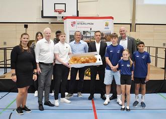 Stefan Rieß, Vertreter der Dillig Architekten GmbH, ging auf zahlreiche bauliche Besonderheiten ein und benannte die am Bau beteiligten Unternehmen. Als abschließenden Höhepunkt überreichte der Architekt als symbolische Geste einen gebackenen Schlüssel. Die Arbeiten wurden im Februar 2024 abgeschlossen, sodass die Halle nunmehr dem Schulbetrieb sowie der außerschulischen Nutzung durch die Vereine zur Verfügung steht. Mit der modernisierten Halle trägt der Eifelkreis Bitburg-Prüm maßgeblich zur Sicherung des schulischen sowie außerschulischen Sportangebotes in der Stadt Bitburg und dem näheren Umland bei.