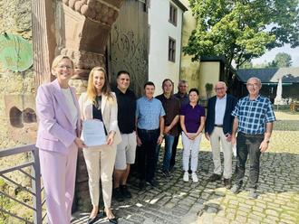 Von links: Simone Schneider (Staatssekretärin), Janine Fischer (Bürgermeisterin VG Bitburger Land), Daniel Lichter (Ortsbürgermeister Rittersdorf), Hans-Jürgen Riemann (Erster Beigeordneter OG Rittersdorf), Achim Herrmann (Pächter), Markus Kiemen (VG), Silvia Herrmann (Pächterin), Rainer Wirtz (Erster Beigeordneter der VG), Josef Hilden (VG). Foto: VG Bitburger Land