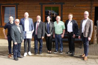 Lierfeld in der Grillhütte: Übergabe des Ergebnisberichtes des Zukunfts-Checks Dorf am 5. Mai 2023 an Ortsbürgermeister Heinz Müsch und die Bürgerinnen und Bürger durch Landrat Andreas Kruppert im Beisein der 1. Beigeordneten Manuela Propson und den Ratsmitgliedern Frank Müsch, Alfred Pick, Karl-Heinz Pauls, Michael Otto sowie Arnold Hoffmann.