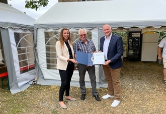 Niederstedem auf dem Dorfplatz: Übergabe des Ergebnisberichtes des Zukunfts-Check Dorf am 23. Juli 2023 an den Ortsbürgermeister Johann Hatz und die Bürgerinnen und Bürger durch Landrat Andreas Kruppert im Beisein von Verbandsgemeindebürgermeisterin Janine Fischer.