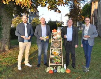 Der Vorsitzende des Kreisbauernverbandes, Stefan Fiedler sowie sein Stellvertreter, Yannik Zender und Kreisgeschäftsführer Andreas Lenz präsentierten Landrat Andreas Kruppert anlässlich des Erntedankfestes bei einem Treffen im Kreishaus einige Erzeugnisse der heimischen Landwirtschaft.