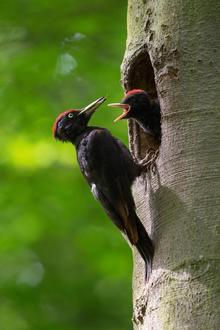 Leicht zu erkennen ist der Schwarzspecht an seinem matt-schwarzen Gefieder; am Kopf trägt das Männchen einen roten Scheitel, der sich beim Weibchen auf einen roten Nackenfleck beschränkt. Mit rund 25 Kilometern in der Stunde zimmert er eine Höhle mit ovalem Eingang, die er mit Holzspänen auspolstert. Die Nesthöhle wird 30 bis 55 cm tief in die Stämme gebaut. Das Weibchen legt in der Höhle Ende März oder Anfang April zwei bis sechs Eier, nach 12 bis 14 Tagen schlüpfen die Jungen und bleiben weitere 28 Tage im Nest. Auf dem Speiseplan des Schwarzspechts stehen vor allem Holz bewohnende Käfer (Borken- und Bockkäfer) sowie Larven und Puppen. Er verschmäht aber auch Ameisen nicht, deren Gänge und Nester er mit wuchtigen Schlägen freilegt. Schwarzspechte sind Standvögel und daher auch im Winter bei uns im Wald zu finden.