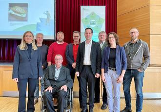 Moritz Petry (stellv. Verbandsvorsteher Zweckverband Naturpark Südeifel, 6. v. li.) freut sich gemeinsam mit den Referenten und Daniela Torgau (Geschäftsführung Zweckverband Naturpark Südeifel, 1. v. li.) sowie Indra Schaperdoth (Naturpark-Fachkraft, 8. v. li.) über die gelungene Veranstaltung (Foto: Naturpark Südeifel/Ansgar Dondelinger).
