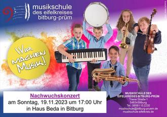 Das Nachwuchskonzert findet am Sonntag, 19.11.2023 um 17:00 Uhr im Haus Beda in Bitburg statt. Der Eintritt ist frei. Die Kreismusikschule freut sich über Ihren Besuch.