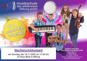 Am Sonntag, den 16.11.2025 um 17:00 Uhr setzt die Musikschule des Eifelkreises eine sehr lange Veranstaltungstradition fort. Seit den 1990er Jahren bietet die Musikschule jungen, talentierten und förderungswürdigen Schülerinnen und Schülern die Möglichkeit, Bühnenerfahrung zu sammeln. Mit Musik durch alle Sparten, von der Pauke bis zum Klavier, von der Klarinette bis zur Harfe und vom Gesang bis zur Trompete, erwartet die Besucher ein abwechslungsreiches Konzertprogramm.