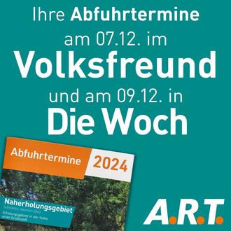 Am Samstag, dem 09.12.2023, erfolgt die Verteilung der Abfuhrtermine 2024 in Trier, dem Landkreis Trier-Saarburg sowie in den Landkreisen Bernkastel-Wittlich, Eifelkreis Bitburg-Prüm und Vulkaneifel. Die Zustellung der knapp 250.000 Kalender erfolgt als Beilage in DIE WOCH. Im Trierischen Volksfreund sind die Abfuhrtermine für Abonnenten bereits am Donnerstag, 07.12. als Beilage zu finden.