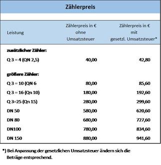 Im Grundpreis ist ein Entgelt für einen Standardwasserzähler mit einer Nenngröße Q 3=4 (Qn2,5) enthalten. Für weitere oder größere Zähler ist zusätzlich ein separater Zählerpreis zu zahlen.