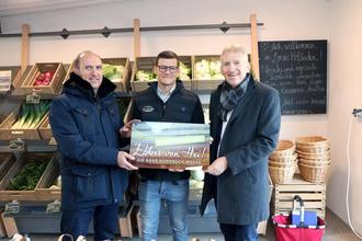 Bei der Übergabe der „Ebbes von Hei!“-Plakette. Von links: Ralf Becker, Vorsitzender von „Ebbes von Hei!“, Marco Lonsdorfer von Gemüsebau Lonsdorfer sowie Landrat Patrik Lauer.