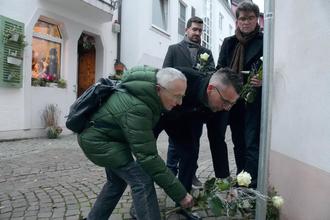 Der Feier voraus ging eine Gedenkminute am Esther-Bejarano-Platz vor der ehemaligen Synagoge in Saarlouis. In Erinnerung an die Saarlouiser Ehrenbürgerin legten OB Marc Speicher, Bürgermeister Carsten Quirin, Beigeordneter Gerald Purucker und Ricarda Kunger weiße Rosen nieder.