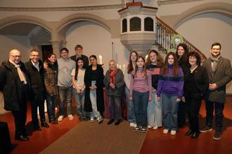 An der Gedenkfeier beteiligten sich auch Schülerinnen und Schüler der Martin-Luther-King Schule in Fraulautern. Sie setzten sich mit Leben und Werk von Esther Bejarano auseinander und formulierten in einem symbolischen Akt wichtige Inhalte sowie Wünsche rund um ihr Leben und die damit verbundene Erinnerungskultur. Die musikalische Gestaltung übernahm Nino Deda.