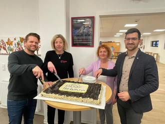 Alexander Guß, Amtsleiter Familie, Soziales, Schulen & Sport, Anette Plewka, Fachkraft der kommunalen Jugendpflege, Sabine Schmitt, Abteilungsleiterin und Bürgermeister Carsten Quirin (von links) schnitten zusammen die Geburtstagstorte an. Foto: Josy Klauk