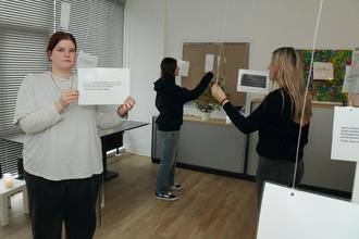 Louisa Stumpf, (links) Bundesfreiwillige, kreierte den „Raum der Stille“, wo man Esthers Zitaten auf Augenhöhe begegnete. Foto: Sascha Schmidt