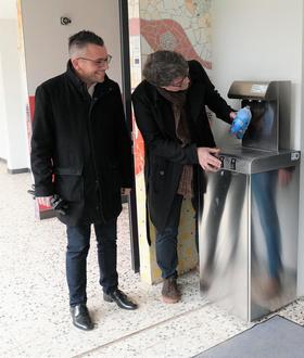 OB Marc Speicher und Beigeordneter Gerald Purucker testen den neuen Spender.