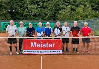 Die Herren 70 der Tennisfreunde Roden konnten sich ungefährdet und ungeschlagen die Meisterschaft in der Landesliga sichern. Nach deutlichen Siegen gegen die SG Warndt (18:3) und bei der SG Morscholz/Nosendel (17:4) folgte ein lupenreiner Erfolg gegen den TC Grün Weiß Altforweiler (21:0). Zum Finale gelang dann noch ein entspanntes 18:3 gegen die SG Orscholz/Schwemlingen II. Somit war die Meisterschaft unter Dach und Fach und der Meistertitel konnte gefeiert werden. Bemerkenswert dabei: In der Saison wurden insgesamt lediglich 2 Einzel und 2 Doppel verloren. Zum Erfolg beigetragen haben folgende Spieler (im Bild v. r. n. l.):