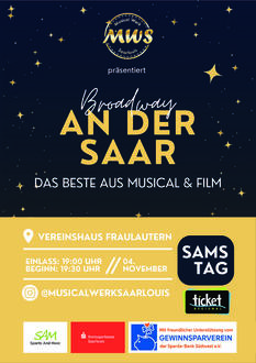 Am 4. November 2023 entführt das dreizehnköpfige Ensemble des Musical Werk Saarlouis e.V. die Zuschauer ab 19:30 Uhr (Einlass 19 Uhr) im Vereinshaus Fraulautern in Saarlouis in die faszinierende Welt des Broadways. Mit einer vielseitigen Auswahl aus Musicals und Filmklassikern wird ein unvergesslicher Abend geboten.