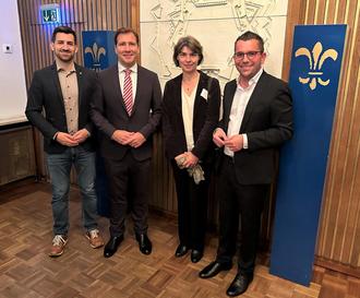 v.l. Bürgermeister Carsten Quirin, Dr. Deniz Alkan (Vorsitz Expertenkommission), Nathalie Nikitenko (Vorsitz Expertenkommission) und Oberbürgermeister Marc Speicher am Abend des Empfangs im Rathaus.