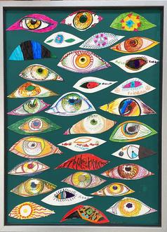 Das Bild (57x77cm) besteht aus 32 farbenprächtig mit Markern bemalte augenförmige Kartons. Der mittlere der gestalteten Augenkartons ist mit Graphitstift signiert und bezeichnet. Teilweise sind auch die Namen der Beteiligten auf ihren Objekten zu finden. Das Kunstwerk ist eine Assemblage, also ein dreidimensionales Bild mit grünem Grund, der für die Fußballspielfläche steht.