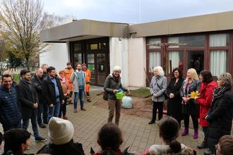 Mit einer Baumpflanzung im Eingangsbereich der Grundschule Steinrausch wurde Bürgermeisterin Marion Jost (mitte) geehrt. Zur offiziellen Einweihung wurde ihr symbolisch eine Gieskanne zur Pflege des jungen Amberbaumes überreicht. Mit dabei waren neben Schulleiterin Donata Mechenbier und der Frauenbeauftragten Sigrid Gehl (1. und 2. von rechts) auch zahlreiche Vertreterinnen und Vertreter der Stadtpolitik und -verwaltung sowie des Frauenbeirates und der Schulgemeinschaft. Fotos: Sascha Schmidt