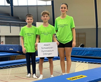 Zum ersten Mal im Saarland, und auch zum ersten Mal bundesweit, wurden Schulmeisterschaften im Trampolinspringen durchgeführt. Austragungsort war die Sporthalle West in Dillingen. Ausrichter waren der TV Germania Dillingen und die Sophie-Scholl-Gemeinschaftsschule, die diesen Wettkampf für insgesamt 16 Schulen mit 24 Mannschaften in drei Wettkampfklassen organisierten. Das ASG nahm in der Wettkampfklasse III (Klassenstufe 9 bis 12) teil. Dabei bestimmt der älteste Teilnehmer einer Mannschaft welcher Wettkampfklasse man zugeordnet wird, sodass Elias Kirsch (Klasse 6E2) und Felix Gindorf (Klasse 6E3) zusammen mit Melany Bonsangue (Klasse 10 IN1) in dieser Wettkampfklasse antreten durften. Der Wettkampf bestand aus zwei Teildisziplinen: einem Durchgang auf dem Großtrampolin und zwei Sprünge auf dem Minitrampolin. Dabei erreichten die Drei in der Kombination der beiden Durchgänge einen hervorragenden 2. Platz in der Mannschaftswertung und mussten sich nur dem Gymnasium am Rotenbühl geschlagen geben. Dabei war Melany zweitbeste Turnerin des Tages. Allen Drei für die gezeigten Leistungen ein großes Kompliment und herzlichen Glückwunsch zur Vize-Saarlandmeisterschaft!