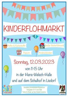 Am Sonntag, den 12.03.2023, findet von 11 bis 15 Uhr der Kinderflohmarkt der Fördervereine der Kita Herz-Jesu und Prof. Ecker Schule in der Hans-Welsch-Halle und auf dem Schulhof in Lisdorf statt. Verkauft wird alles rund ums Kind. Tische können unter boersekitalisdorf@gmail.com reserviert werden. Die Tischgebühr beträgt 10 Euro. Kinder können auf dem Schulhof ihre Spielsachen verkaufen. Zusätzlich gibt es einen Bücherflohmarkt auf dem Schulhof.