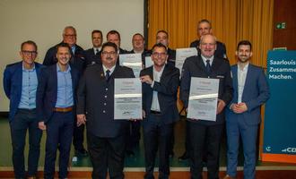 Die Vertreter der vier Saarlouiser Löschbezirke, der Jugendfeuerwehr, der Fördervereine sowie der Wehrführer Knut Kempeni mit dem Saarlouiser Stadtverbandsvorsitzenden Marc Speicher MdL sowie Raphael Schäfer MdL, Frank Wagner MdL und Carsten Quirin.