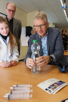 Was in dem Labor alles möglich ist, konnte man bei der Einweihung eindrucksvoll beobachten. Nach der Begrüßung durch den Schulleiter und Grußworte von Landrat Lauer und Bürgermeister Berg gab Professor Peschel den Gästen einen spannenden Einblick in das Konzept des GOFEX – zuerst mit einer theoretischen Präsentation, dann mit einem anschließenden praktischen Teil. Nicht nur der Landrat, sondern vor allem die anwesenden Schülerinnen und Schüler hatten hier ihren Spaß am Experimentieren, Beobachten und Entdecken, am Rätseln und am Erklärungen suchen – und bestimmt auch ein bisschen am Spielen mit Wasser. Beim Experiment des „Kartesischen Tauchers“ (auch „Flaschenteufel“ genannt) ging es um die Beobachtung, dass Flüssigkeiten nicht komprimierbar sind, Gase hingegen schon. Für dieses Experiment füllt man eine Plastikflasche voll Wasser und steckt einen kleinen, mit Luft gefüllten Gegenstand hinein und verschließt die Flasche. Drückt man auf die Mitte der Flasche, lässt sich beobachten, dass der Gegenstand nach unten auf den Flaschenboden sinkt. Lässt man die Flasche los, steigt der Gegenstand wieder nach oben. Im Anschluss an das Experiment ging man dazu noch in eine gemeinsame Reflexion.